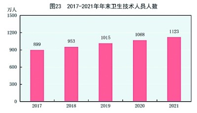 年末全國(guó)共有醫(yī)療衛(wèi)生機(jī)構(gòu)103.1萬(wàn)個(gè),其中醫(yī)院3.7萬(wàn)個(gè),在醫(yī)院中有公立醫(yī)院1.2萬(wàn)個(gè),民營(yíng)醫(yī)院2.5萬(wàn)個(gè);基層醫(yī)療衛(wèi)生機(jī)構(gòu)97.7萬(wàn)個(gè),其中鄉(xiāng)鎮(zhèn)衛(wèi)生院3.5萬(wàn)個(gè),社區(qū)衛(wèi)生服務(wù)中心(站)3.6萬(wàn)個(gè),門診部(所)30.7萬(wàn)個(gè),村衛(wèi)生室59.9萬(wàn)個(gè);專業(yè)公共衛(wèi)生機(jī)構(gòu)1.3萬(wàn)個(gè),其中疾病預(yù)防控制中心3380個(gè),衛(wèi)生監(jiān)督所(中心)2790個(gè)。年末衛(wèi)生技術(shù)人員1123萬(wàn)人,其中執(zhí)業(yè)醫(yī)師和執(zhí)業(yè)助理醫(yī)師427萬(wàn)人,注冊(cè)護(hù)士502萬(wàn)人。醫(yī)療衛(wèi)生機(jī)構(gòu)床位957萬(wàn)張,其中醫(yī)院748萬(wàn)張,鄉(xiāng)鎮(zhèn)衛(wèi)生院144萬(wàn)張。全年總診療人次[70]85.3億人次,出院人數(shù)[71]2.4億人。截至年末,全國(guó)累計(jì)報(bào)告新型冠狀病毒肺炎確診病例102314例,累計(jì)治愈出院病例94792例,累計(jì)死亡4636人。全國(guó)累計(jì)報(bào)告接種新型冠狀病毒疫苗283533萬(wàn)劑次。全國(guó)共有11937家醫(yī)療衛(wèi)生機(jī)構(gòu)提供新型冠狀病毒核酸檢測(cè)服務(wù),總檢測(cè)能力達(dá)到4168萬(wàn)份/天。(見(jiàn)圖23)