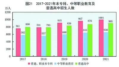 全年研究生教育招生117.7萬(wàn)人,在學(xué)研究生333.2萬(wàn)人,畢業(yè)生77.3萬(wàn)人。普通、職業(yè)本專科[65]招生1001.3萬(wàn)人,在校生3496.1萬(wàn)人,畢業(yè)生826.5萬(wàn)人。中等職業(yè)教育[66]招生656.2萬(wàn)人,在校生1738.5萬(wàn)人,畢業(yè)生484.1萬(wàn)人。普通高中招生905.0萬(wàn)人,在校生2605.0萬(wàn)人,畢業(yè)生780.2萬(wàn)人。初中招生1705.4萬(wàn)人,在校生5018.4萬(wàn)人,畢業(yè)生1587.1萬(wàn)人。普通小學(xué)招生1782.6萬(wàn)人,在校生10779.9萬(wàn)人,畢業(yè)生1718.0萬(wàn)人。特殊教育招生14.9萬(wàn)人,在校生92.0萬(wàn)人,畢業(yè)生14.6萬(wàn)人。學(xué)前教育在園幼兒4805.2萬(wàn)人。九年義務(wù)教育鞏固率為95.4%,高中階段毛入學(xué)率為91.4%。(見(jiàn)圖21)