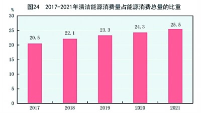 初步核算,全年能源消費(fèi)總量52.4億噸標(biāo)準(zhǔn)煤,比上年增長(zhǎng)5.2%。煤炭消費(fèi)量增長(zhǎng)4.6%,原油消費(fèi)量增長(zhǎng)4.1%,天然氣消費(fèi)量增長(zhǎng)12.5%,電力消費(fèi)量增長(zhǎng)10.3%。煤炭消費(fèi)量占能源消費(fèi)總量的56.0%,比上年下降0.9個(gè)百分點(diǎn);天然氣、水電、核電、風(fēng)電、太陽(yáng)能發(fā)電等清潔能源消費(fèi)量占能源消費(fèi)總量的25.5%,上升1.2個(gè)百分點(diǎn)。重點(diǎn)耗能工業(yè)企業(yè)單位電石綜合能耗下降5.3%,單位合成氨綜合能耗與上年持平,噸鋼綜合能耗下降0.4%,單位電解鋁綜合能耗下降2.1%,每千瓦時(shí)火力發(fā)電標(biāo)準(zhǔn)煤耗下降0.5%。全國(guó)萬(wàn)元國(guó)內(nèi)生產(chǎn)總值二氧化碳排放[78]下降3.8%。(見(jiàn)圖24)