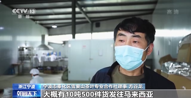 寧波市奉化區(qū)雪竇山茶葉專業(yè)合作社理事 方谷龍:我們這個(gè)集裝箱大概有10噸500件貨發(fā)往馬來西亞,這個(gè)是我們今年第6批出口。