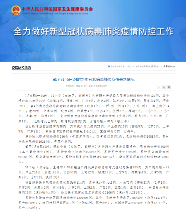截至7月6日24時,據(jù)31個?。ㄗ灾螀^(qū)、直轄市)和新疆生產(chǎn)建設兵團報告,現(xiàn)有確診病例809例(其中重癥病例1例),累計治愈出院病例220265例,累計死亡病例5226例,累計報告確診病例226300例,現(xiàn)有疑似病例1例。累計追蹤到密切接觸者4300874人,尚在醫(yī)學觀察的密切接觸者65940人。