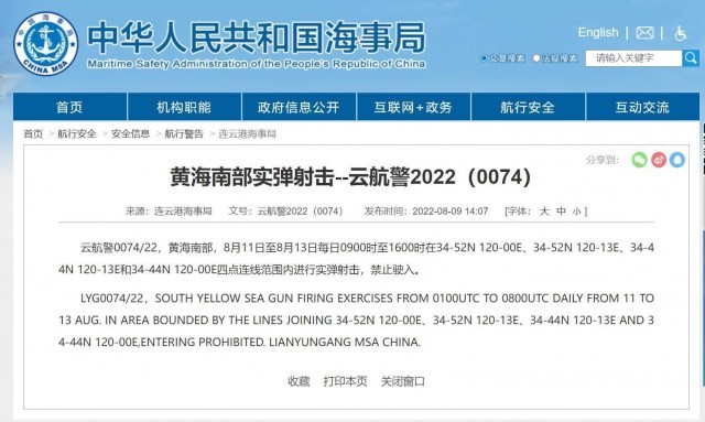 江蘇連云港海事局日前發(fā)布航行警告,今起(8月11日)至13日每日9時至16時在黃海南部海域進行實彈射擊,禁止駛?cè)搿?/p>