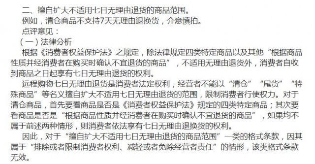 因此,對于“擅自擴(kuò)大不適用七日無理由退貨的商品范圍”一類的格式條款,因其屬于“排除或者限制消費者權(quán)利、減輕或者免除經(jīng)營者責(zé)任”的情形,該類格式條款無效。(中新財經(jīng))