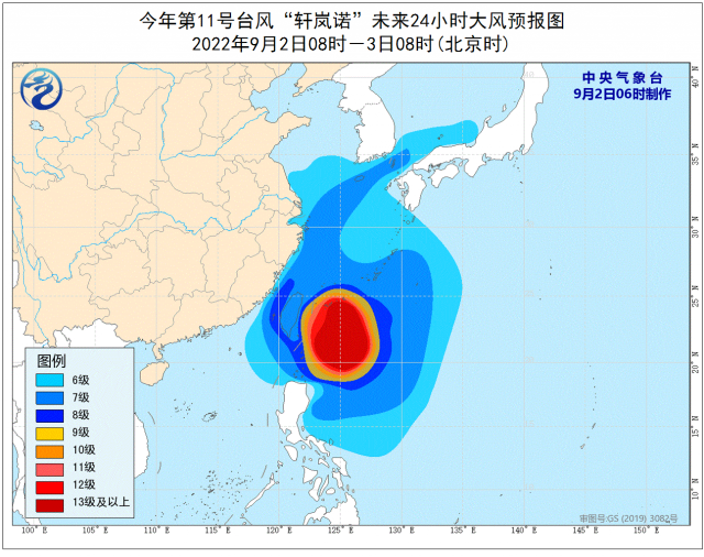 大風預報:9月2日08時至3日08時,巴士海峽、臺灣海峽、臺灣以東洋面、東海大部及釣魚島附近海域、長江口區(qū)、杭州灣,以及臺灣島北部和東部沿海、福建中北部沿海、浙江沿海、上海沿海、江蘇南部沿海將有6-8級大風,陣風9-10級,其中臺灣以東洋面的風力有9-12級,陣風11-15級,“軒嵐諾”中心經(jīng)過的附近海面的風力有13-15級,陣風可達16-17級。