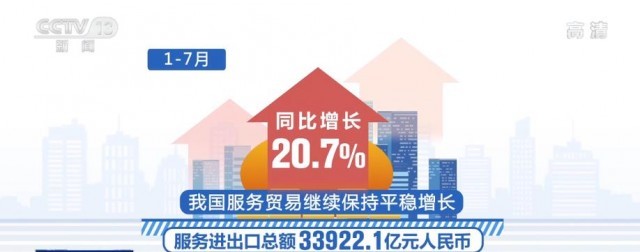 央視網(wǎng)消息:今年1—7月份,我國(guó)服務(wù)進(jìn)出口總額達(dá)33922.1億元,我國(guó)服務(wù)貿(mào)易繼續(xù)保持平穩(wěn)增長(zhǎng)。