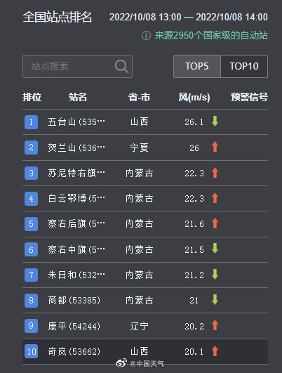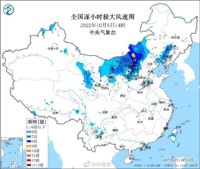 今天(10月8日)14時左右,內(nèi)蒙古中西部、寧夏等地已出現(xiàn)9級以上烈風(fēng)。隨著冷空氣繼續(xù)推進(jìn),9日至10日,華北、東北地區(qū)及黃淮、江淮等地也將先后出現(xiàn)5~6級偏北風(fēng),部分地區(qū)陣風(fēng)7~9級,內(nèi)蒙古中部、華北北部局地可達(dá)10級,尤其京津冀及河南、山東等局地大風(fēng)有一定極端性。