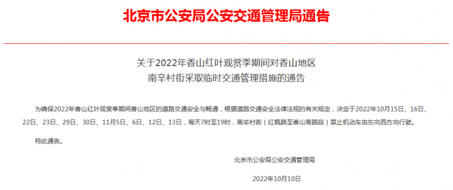 北京市交管局網(wǎng)站發(fā)布通告,為確保今年香山紅葉觀賞季期間的道路交通安全與暢通,10月15日、16日、22日、23日、29日、30日、11月5日、6日、12日、13日,每天7時至19時,南辛村街(紅楓路至香山南路段)禁止機動車由東向西方向行駛。