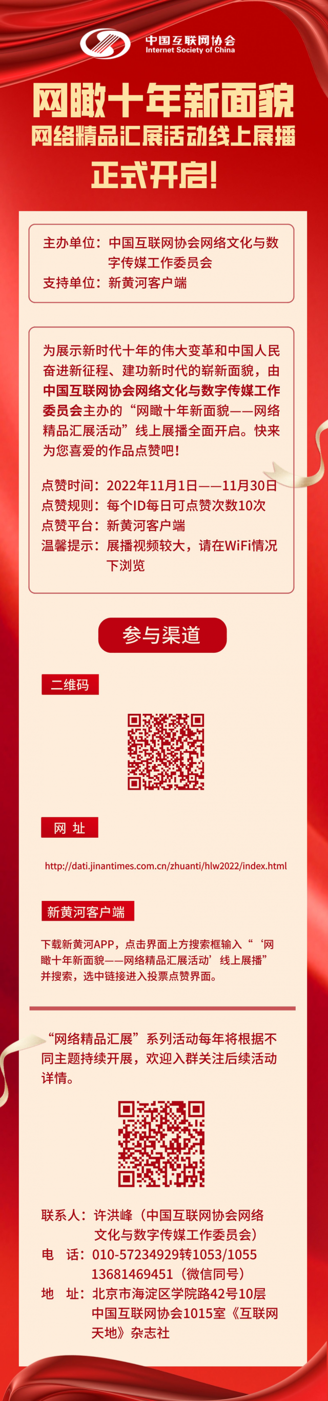 為展示新時(shí)代十年的偉大變革和中國人民奮進(jìn)新征程、建功新時(shí)代的嶄新面貌,11月1日,由中國互聯(lián)網(wǎng)協(xié)會(huì)網(wǎng)絡(luò)文化與數(shù)字傳媒工作委員會(huì)(以下簡稱工作委員會(huì))主辦的“網(wǎng)絡(luò)精品匯展”第三季“網(wǎng)瞰十年新面貌”網(wǎng)絡(luò)精品匯展活動(dòng)線上展播啟動(dòng),在網(wǎng)絡(luò)空間唱響正能量。歡迎廣大網(wǎng)民點(diǎn)擊“閱讀原文”進(jìn)入活動(dòng)頁面為喜愛的作品點(diǎn)贊,展播時(shí)間截至11月30日。