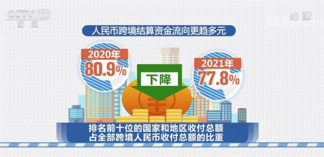央視網(wǎng)消息:經(jīng)過(guò)十余年的發(fā)展,人民幣國(guó)際化正煥發(fā)出旺盛的生命力。數(shù)據(jù)顯示,2021年,人民幣跨境收付金額創(chuàng)歷史新高。在我國(guó)金融機(jī)構(gòu)、企業(yè)和個(gè)人開(kāi)展的跨境交易總額中,有近一半已經(jīng)使用人民幣進(jìn)行結(jié)算。