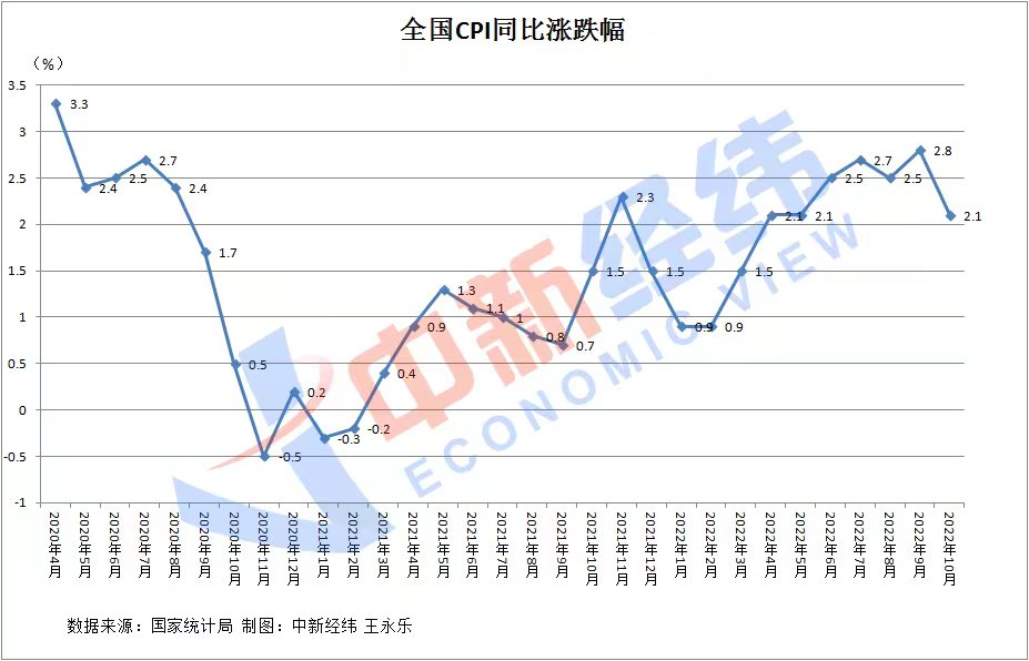 國家統(tǒng)計(jì)局?jǐn)?shù)據(jù)顯示,2022年10月,全國CPI環(huán)比上漲0.1%,同比上漲2.1%。同比漲幅較9月明顯回落,且連續(xù)第4個(gè)月低于市場預(yù)期。
