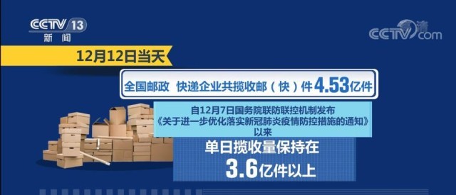 國(guó)家郵政局?jǐn)?shù)據(jù)顯示,12月1日—12日,郵政快遞行業(yè)攬收量約為43.03億件,同比上升5.6%。12月12日當(dāng)天,全國(guó)郵政、快遞企業(yè)共攬收郵(快)件4.53億件。自12月7日國(guó)務(wù)院聯(lián)防聯(lián)控機(jī)制發(fā)布《關(guān)于進(jìn)一步優(yōu)化落實(shí)新冠肺炎疫情防控措施的通知》以來(lái),單日攬收量保持在3.6億件以上。