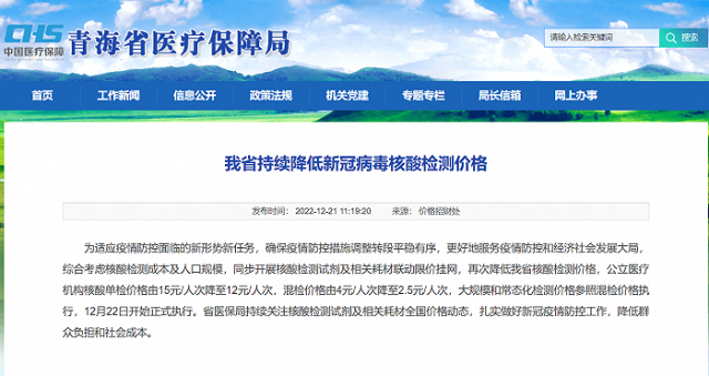 據(jù)青海省醫(yī)療保障局網(wǎng)站消息,為適應(yīng)疫情防控面臨的新形勢新任務(wù),確保疫情防控措施調(diào)整轉(zhuǎn)段平穩(wěn)有序,更好地服務(wù)疫情防控和經(jīng)濟社會發(fā)展大局,綜合考慮核酸檢測成本及人口規(guī)模,同步開展核酸檢測試劑及相關(guān)耗材聯(lián)動限價掛網(wǎng),再次降低青海省核酸檢測價格,公立醫(yī)療機構(gòu)核酸單檢價格由15元/人次降至12元/人次,混檢價格由4元/人次降至2.5元/人次,大規(guī)模和常態(tài)化檢測價格參照混檢價格執(zhí)行,12月22日開始正式執(zhí)行。省醫(yī)保局持續(xù)關(guān)注核酸檢測試劑及相關(guān)耗材全國價格動態(tài),扎實做好新冠疫情防控工作,降低群眾負擔和社會成本。