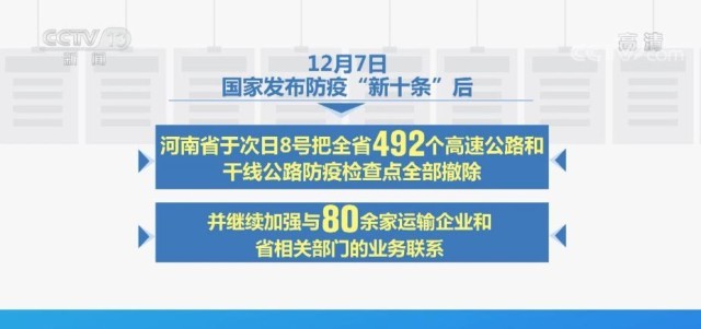 據(jù)了解,12月7日,國家發(fā)布防疫“新十條”后,河南省于次日把全省492個高速公路和干線公路防疫檢查點全部撤除,并繼續(xù)加強與80余家運輸企業(yè)和省相關(guān)部門的業(yè)務(wù)聯(lián)系,充分發(fā)揮“12328服務(wù)監(jiān)督熱線+三級調(diào)度”機制作用,每日收集運輸受阻問題,以便及時解決問題。