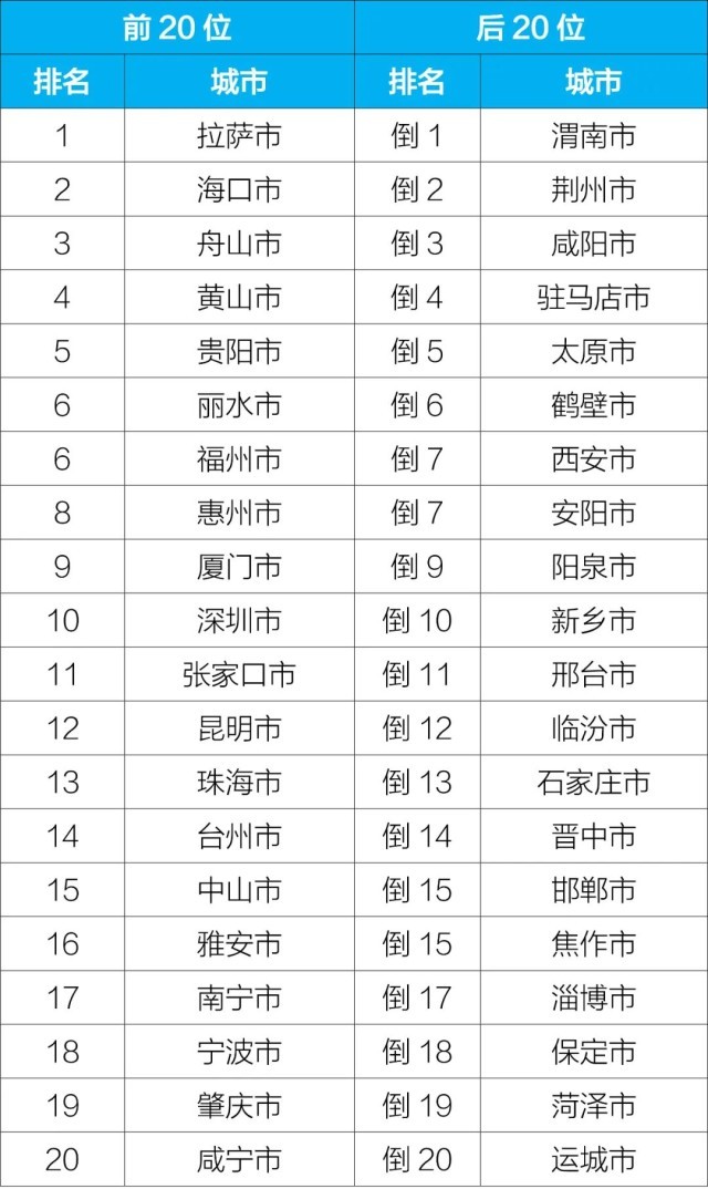 1—11月,168個(gè)重點(diǎn)城市中,拉薩、??诤椭凵绞械瘸鞘锌諝赓|(zhì)量相對(duì)較好(從第1名至第20名);渭南、荊州和咸陽(yáng)市等城市空氣質(zhì)量相對(duì)較差(從倒數(shù)第1名至倒數(shù)第20名),見附表2。
