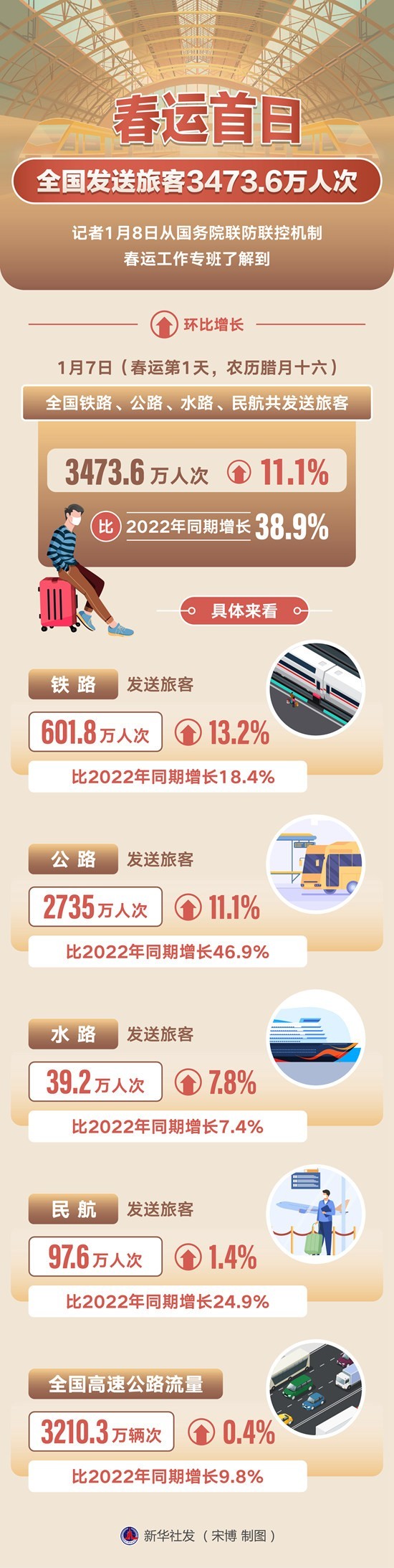 記者1月8日從國務(wù)院聯(lián)防聯(lián)控機(jī)制春運(yùn)工作專班了解到,1月7日(春運(yùn)第1天,農(nóng)歷臘月十六)全國鐵路、公路、水路、民航共發(fā)送旅客3473.6萬人次,環(huán)比增長11.1%,比2022年同期增長38.9%。宋博/制圖(新華社發(fā))