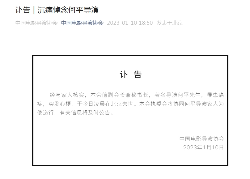 中新網(wǎng)1月10日電 據(jù)中國(guó)電影導(dǎo)演協(xié)會(huì)消息,經(jīng)與家人核實(shí),中國(guó)電影導(dǎo)演協(xié)會(huì)前副會(huì)長(zhǎng)兼秘書(shū)長(zhǎng),著名導(dǎo)演何平先生,罹患癌癥,突發(fā)心梗,于1月10日凌晨在北京去世。中國(guó)電影導(dǎo)演協(xié)會(huì)執(zhí)委會(huì)將協(xié)同何平導(dǎo)演家人為他送行,有關(guān)信息將及時(shí)公告。