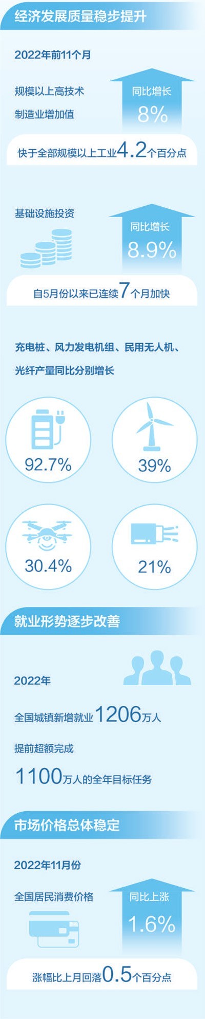 2022年,面對(duì)風(fēng)高浪急的國際環(huán)境和艱巨繁重的國內(nèi)改革發(fā)展穩(wěn)定任務(wù),我國經(jīng)濟(jì)穩(wěn)健發(fā)展,全年國內(nèi)生產(chǎn)總值預(yù)計(jì)超過120萬億元。看供給結(jié)構(gòu),產(chǎn)業(yè)升級(jí)發(fā)展持續(xù),新動(dòng)能積蓄增強(qiáng)。2022年前11個(gè)月,規(guī)模以上高技術(shù)制造業(yè)增加值同比增長(zhǎng)8%,快于全部規(guī)模以上工業(yè)4.2個(gè)百分點(diǎn);看消費(fèi)需求,線上消費(fèi)需求釋放帶動(dòng)作用明顯。前11個(gè)月,全國實(shí)物商品網(wǎng)上零售額同比增長(zhǎng)6.4%,網(wǎng)絡(luò)購物帶動(dòng)快遞等行業(yè)較快增長(zhǎng)。