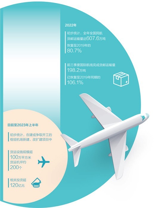 民航局有關(guān)負(fù)責(zé)人介紹,過去5年,航空貨運(yùn)基礎(chǔ)設(shè)施建設(shè)取得積極進(jìn)展,新增航空貨運(yùn)能力600萬噸以上。下一步,將加強(qiáng)航空貨運(yùn)設(shè)施規(guī)劃建設(shè)指導(dǎo),初步統(tǒng)計(jì),目前至2023年上半年在建或爭(zhēng)取開工的樞紐機(jī)場(chǎng)新建、改擴(kuò)建項(xiàng)目中,貨運(yùn)設(shè)施規(guī)模已超過100萬平方米、貨運(yùn)機(jī)坪約200個(gè),相關(guān)投資超過120億元。