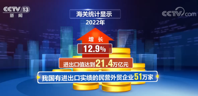 海關(guān)統(tǒng)計(jì)顯示,2022年,我國有進(jìn)出口實(shí)績(jī)的民營(yíng)外貿(mào)企業(yè)51萬家,進(jìn)出口值達(dá)到21.4萬億元,增長(zhǎng)12.9%。2022年,民營(yíng)企業(yè)進(jìn)出口規(guī)模所占比重達(dá)到了50.9%,較上年提高2.3個(gè)百分點(diǎn),對(duì)我國外貿(mào)增長(zhǎng)的貢獻(xiàn)率達(dá)80.8%。
