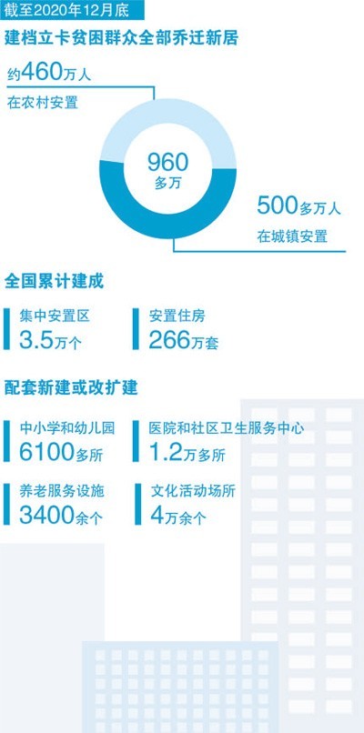 習(xí)近平總書記強(qiáng)調(diào):“易地搬遷是解決一方水土養(yǎng)不好一方人、實現(xiàn)貧困群眾跨越式發(fā)展的根本途徑,也是打贏脫貧攻堅戰(zhàn)的重要途徑?!秉h的十八大以來,全國累計建成集中安置區(qū)3.5萬個、安置住房266萬套。到2020年底,全國易地扶貧搬遷規(guī)劃建設(shè)任務(wù)全面完成,近千萬生活在“一方水土難養(yǎng)一方人”地方的建檔立卡貧困人口實現(xiàn)易地扶貧搬遷,搬入新家園、開啟新生活。
