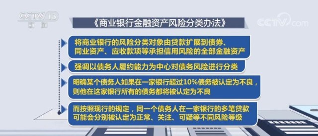 信用風(fēng)險是我國銀行業(yè)面臨的最主要風(fēng)險,辦法將商業(yè)銀行的風(fēng)險分類對象由貸款擴(kuò)展到債券、同業(yè)資產(chǎn)、應(yīng)收款項等承擔(dān)信用風(fēng)險的全部金融資產(chǎn)。強(qiáng)調(diào)以債務(wù)人履約能力為中心對債務(wù)風(fēng)險進(jìn)行分類。明確某個債務(wù)人如果在一家銀行超過10%債務(wù)被認(rèn)定為不良,則他在這家銀行所有的債務(wù)都將被認(rèn)定為不良。而按照現(xiàn)行的規(guī)定,同一個債務(wù)人在一家銀行的多筆貸款可能會分別被認(rèn)定為正常、關(guān)注、可疑等不同風(fēng)險等級。