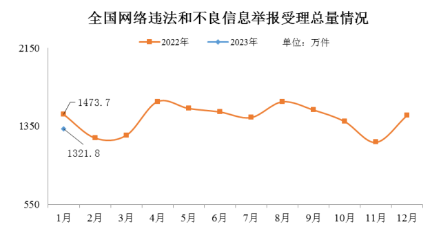 2023年1月全國(guó)受理網(wǎng)絡(luò)違法和不良信息舉報(bào)1321.8萬(wàn)件