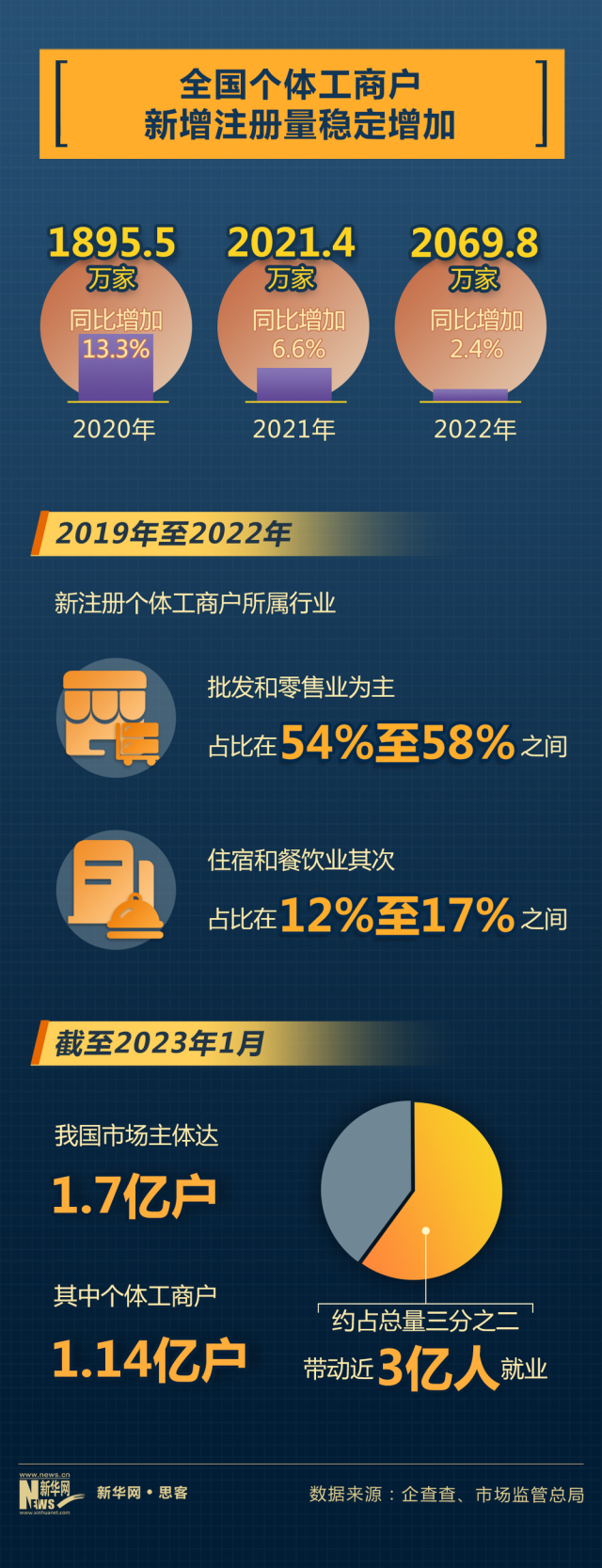 近日市場監(jiān)管總局統(tǒng)計顯示,截至2023年1月,我國市場主體達1.7億戶,其中個體工商戶1.14億戶,約占總量三分之二,帶動近3億人就業(yè)。