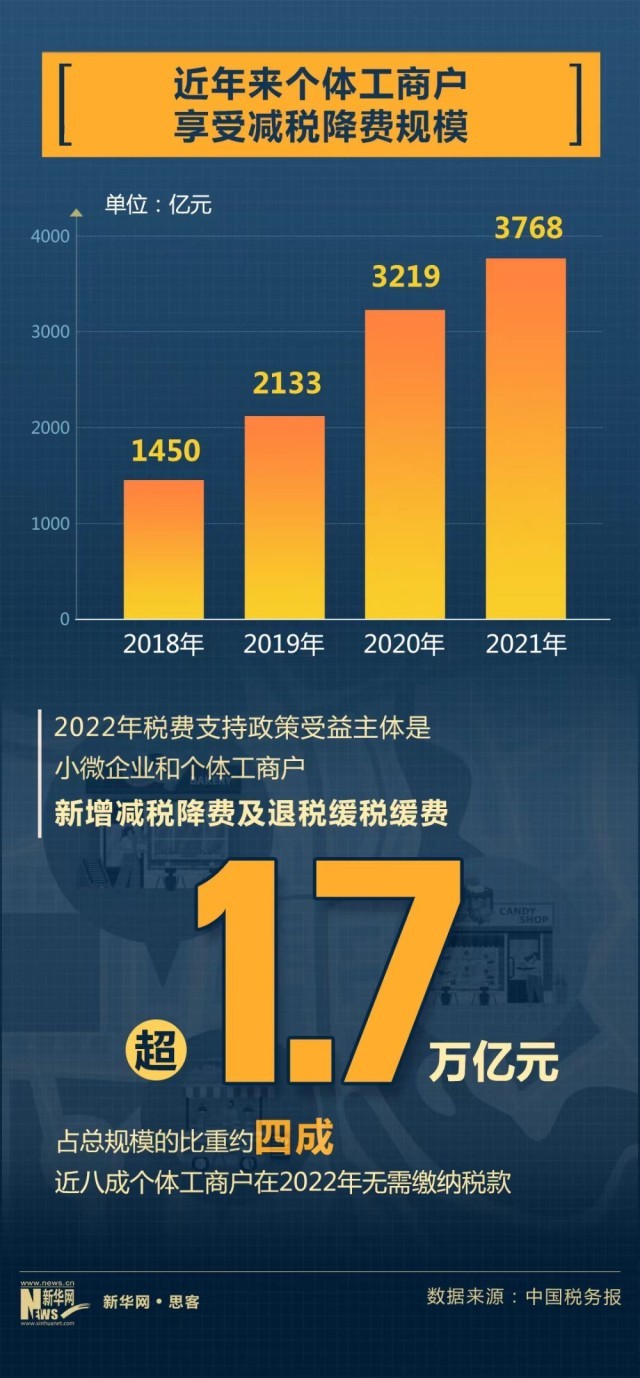 2021年,我國將包括個體工商戶在內(nèi)的小規(guī)模納稅人增值稅免稅月銷售額從10萬元提高到15萬元,對個體工商戶應納稅所得額不超過100萬元的部分,在已有優(yōu)惠政策的基礎上減半征收個人所得稅。