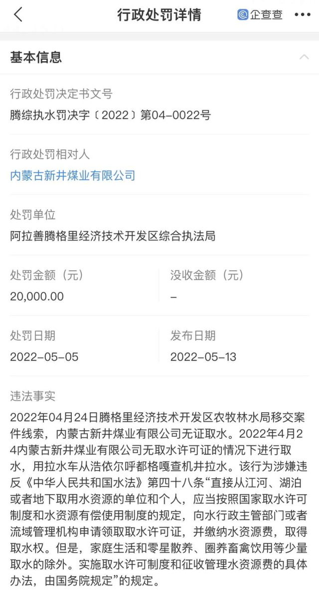 2022年該公司欠繳資源稅800多萬(wàn)元、增值稅200多萬(wàn)元,還因無(wú)取水許可證的情況下取水,被阿拉善騰格里經(jīng)濟(jì)技術(shù)開發(fā)區(qū)綜合執(zhí)法局行政處罰2萬(wàn)元。