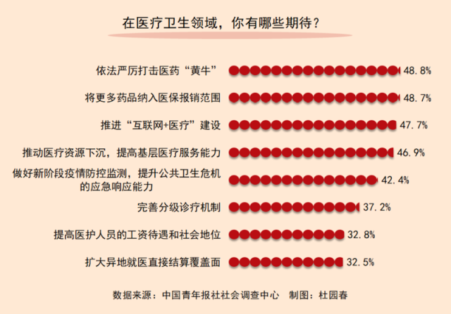 在醫(yī)療衛(wèi)生領(lǐng)域,受訪者的期待還有:做好新階段疫情防控監(jiān)測,提升公共衛(wèi)生危機(jī)的應(yīng)急響應(yīng)能力(42.4%),完善分級(jí)診療機(jī)制(37.2%),提高醫(yī)護(hù)人員的工資待遇和社會(huì)地位(32.8%),擴(kuò)大異地就醫(yī)直接結(jié)算覆蓋面(32.5%),加大中醫(yī)藥產(chǎn)品的開發(fā)和運(yùn)用(24.4%),加強(qiáng)中醫(yī)人才隊(duì)伍培養(yǎng),推進(jìn)中醫(yī)藥傳承創(chuàng)新(20.0%)等。