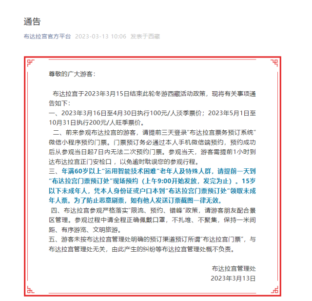 央視網(wǎng)消息:據(jù)布達拉宮官方平臺微信公眾號消息,布達拉宮于2023年3月15日結(jié)束此輪冬游西藏活動政策,現(xiàn)將有關(guān)事項通告如下: