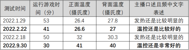 問題描述:博主于2022年1月至9月先后4次對(duì)不同手機(jī)進(jìn)行溫度測(cè)試。在經(jīng)過一定時(shí)間運(yùn)行游戲后,使用測(cè)溫儀對(duì)手機(jī)正面及背面進(jìn)行測(cè)溫,并對(duì)手機(jī)的溫控效果進(jìn)行點(diǎn)評(píng),4次測(cè)評(píng)結(jié)果出入較大,不同品牌的手機(jī)測(cè)評(píng)前后標(biāo)準(zhǔn)不一。