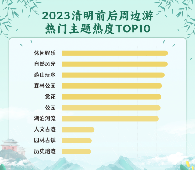 據(jù)某旅游票務(wù)平臺發(fā)布的《2023清明假期出游趨勢報告》,清明期間,本地及周邊短途出游是主流,出游主題上具有顯著的春游季特征。《報告》顯示,清明假期(4月5日)前后周邊游的熱門主題按照熱度排序依次為休閑娛樂、自然風光、游山玩水、森林公園、賞花、公園等。前十個熱門主題中,具有賞花踏青屬性的主題占據(jù)了六席。