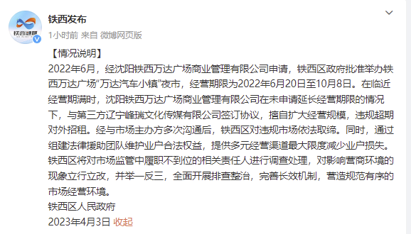 央視網(wǎng)消息:據(jù)@鐵西發(fā)布 微博4月3日消息,鐵西區(qū)人民政府發(fā)布情況說明。2022年6月,經(jīng)沈陽鐵西萬達(dá)廣場商業(yè)管理有限公司申請,鐵西區(qū)政府批準(zhǔn)舉辦鐵西萬達(dá)廣場“萬達(dá)汽車小鎮(zhèn)”夜市,經(jīng)營期限為2022年6月20日至10月8日。在臨近經(jīng)營期滿時,沈陽鐵西萬達(dá)廣場商業(yè)管理有限公司在未申請延長經(jīng)營期限的情況下,與第三方遼寧峰瑞文化傳媒有限公司簽訂協(xié)議,擅自擴(kuò)大經(jīng)營規(guī)模,違規(guī)超期對外招租。經(jīng)與市場主辦方多次溝通后,鐵西區(qū)對違規(guī)市場依法取締。同時,通過組建法律援助團(tuán)隊維護(hù)業(yè)戶合法權(quán)益,提供多元經(jīng)營渠道最大限度減少業(yè)戶損失。