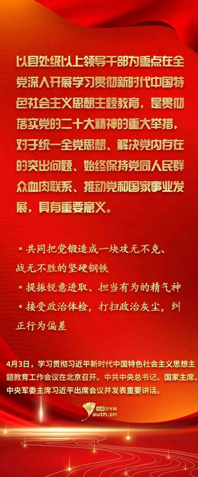 4月3日,學(xué)習(xí)貫徹習(xí)近平新時代中國特色社會主義思想主題教育工作會議在北京召開。中共中央總書記、國家主席、中央軍委主席習(xí)近平出席會議并發(fā)表重要講話。