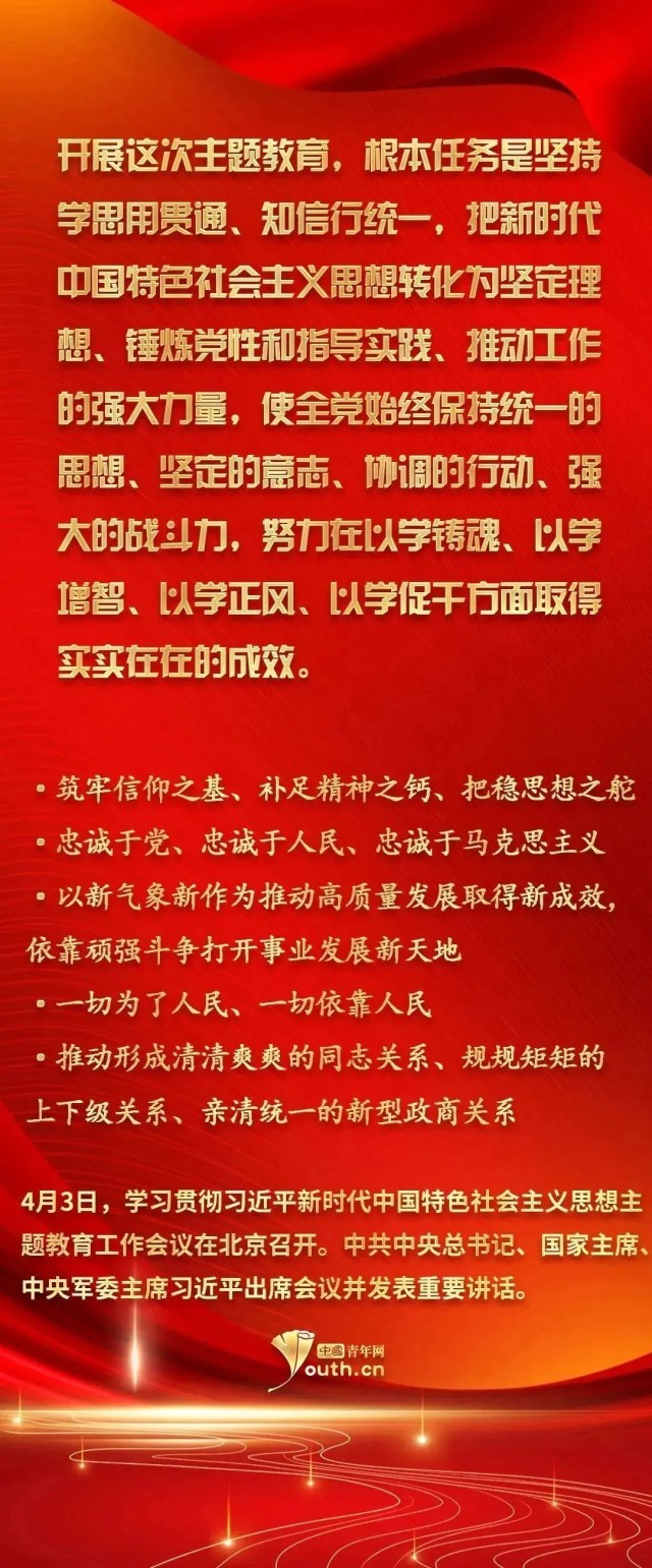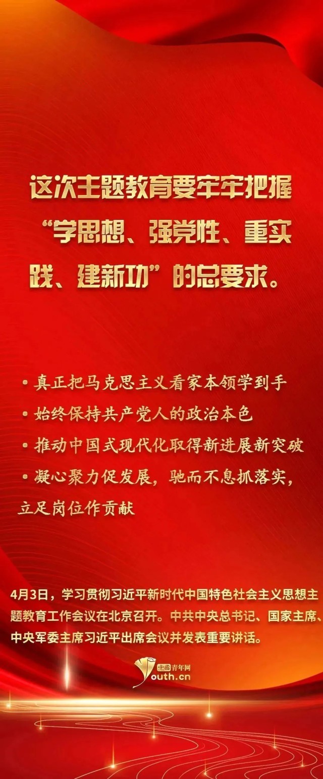 習(xí)近平新時代中國特色社會主義思想實現(xiàn)了馬克思主義中國化新的飛躍。此次開展學(xué)習(xí)貫徹習(xí)近平新時代中國特色社會主義思想主題教育,是一件事關(guān)全局的大事。廣大青年要以這次主題教育為契機,用黨的科學(xué)理論武裝頭腦,在學(xué)習(xí)習(xí)近平新時代中國特色社會主義思想中不斷筑牢信仰之基、補足精神之鈣、把穩(wěn)思想之舵。