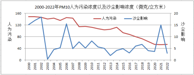 2000-2022年P(guān)M10人為污染濃度以及沙塵影響濃度變化圖。圖片來源:北京市生態(tài)環(huán)境監(jiān)測(cè)中心