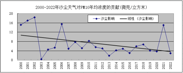2000-2022年沙塵天氣對(duì)PM10年均濃度貢獻(xiàn)變化圖。圖片來源:北京市生態(tài)環(huán)境監(jiān)測(cè)中心