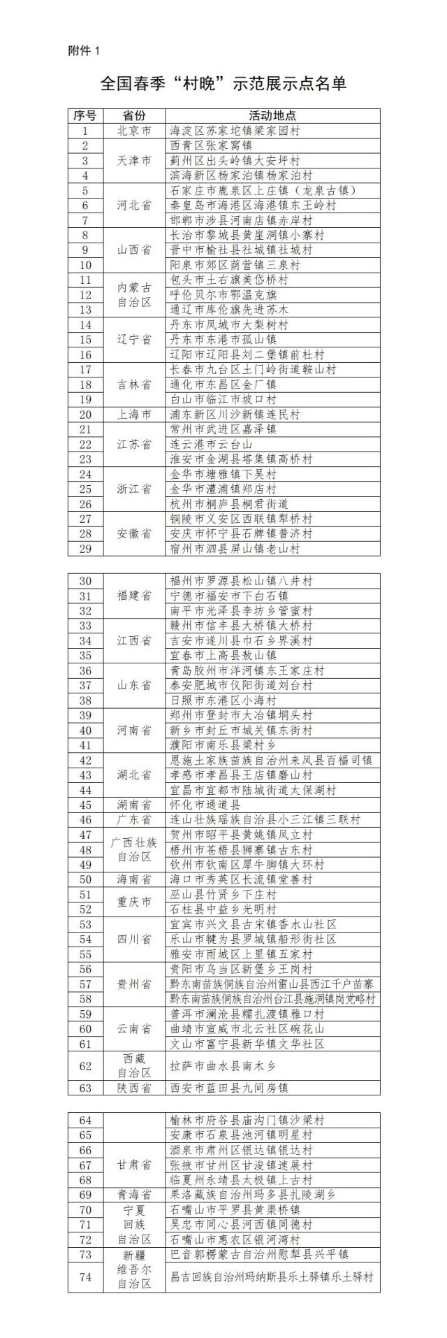 央視網(wǎng)消息:據(jù)文化和旅游部網(wǎng)站消息,根據(jù)《文化和旅游部辦公廳關(guān)于開展“四季村晚”活動的通知》(辦公共發(fā)〔2023〕52號)要求,文化和旅游部公共服務(wù)司在各省級文化和旅游行政部門申報(bào)推薦的基礎(chǔ)上,經(jīng)研究,確定春季“村晚”主會場設(shè)在四川省宜賓市、夏季“村晚”主會場設(shè)在云南省麗江市、秋季“村晚”主會場設(shè)在江西省九江市、冬季“村晚”主會場設(shè)在浙江省麗水市、廣西壯族自治區(qū)柳州市,并確定了“四季村晚”示范展示點(diǎn)名單,現(xiàn)予以公布。