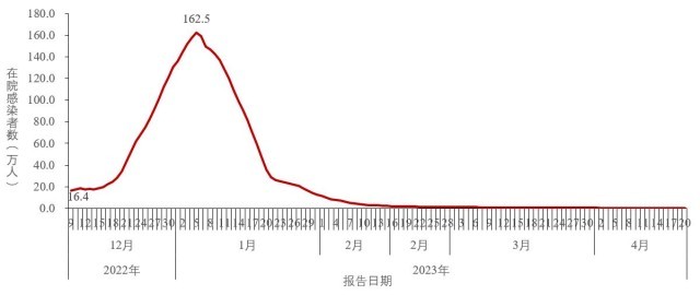?。ㄒ唬┰谠盒鹿诓《靖腥菊呓Y(jié)果。全國在院新冠病毒感染者于2023年1月5日達到峰值162.5萬人,隨后持續(xù)下降;4月20日下降至3929例,較峰值減少了99.8%(圖3-1)。