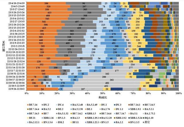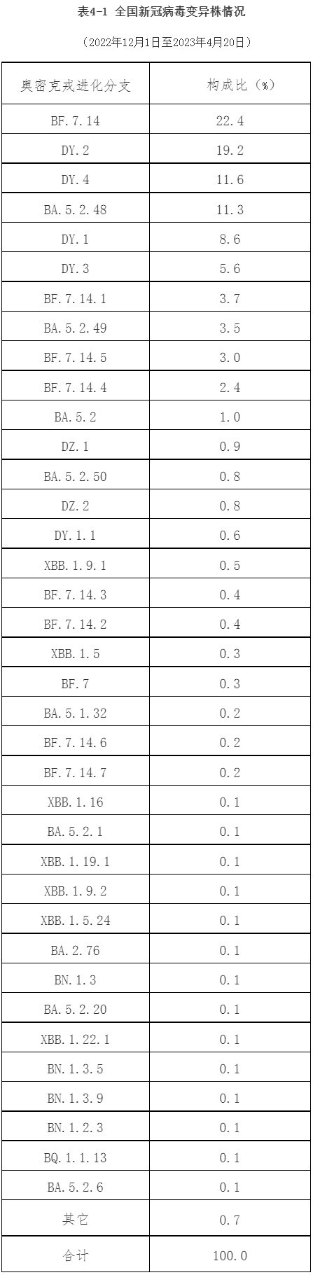 ?。ǘ?2月以來本土病例病毒變異株監(jiān)測情況。2022年12月1日至2023年4月20日,全國共報送32993例本土病例新冠病毒基因組有效序列,均為奧密克戎變異株,涵蓋117個進化分支。主要流行株為BA.5.2及其亞分支(構(gòu)成比64.3%)和BF.7及其亞分支(構(gòu)成比33.0%)等。其中,BA.5.2及其亞分支包括DY.2(19.2%)、DY.4(11.6%)、BA.5.2.48(11.3%)、DY.1(8.6%)、DY.3(5.6%)和BA.5.2.49(3.5%)等;BF.7及其亞分支包括BF.7.14(22.4%)、BF.7.14.1(3.7%)、BF.7.14.5(3.0%)、BF.7.14.4(2.4%)、BF.7.14.3(0.4%)和BF.7.14.2(0.3%)等(表4-1)。共監(jiān)測到本土重點關(guān)注變異株603例,其中,4例BQ.1、4例BQ.1.1、19例BQ.1.1.13、1例BQ.1.1.17、1例BQ.1.1.18、1例BQ.1.1.35、1例BQ.1.1.38、1例BQ.1.1.46、1例BQ.1.1.53、2例BQ.1.1.66、1例BQ.1.1.69、8例BQ.1.2、1例BQ.1.23、2例BQ.1.8、2例CH.1.1、3例CH.1.1.1、1例CH.1.1.11、1例DT.2、1例EA.1、2例EG.1、3例EL.1、7例EM.1、1例EU.1.1、2例FB.1、3例FE.1、1例XBB、4例XBB.1、2例XBB.1.11.1、1例XBB.1.12、4例XBB.1.15、42例XBB.1.16、5例XBB.1.16.1、16例XBB.1.17.1、37例XBB.1.19.1、2例XBB.1.22、22例XBB.1.22.1、1例XBB.1.23、5例XBB.1.24、1例XBB.1.4、109例XBB.1.5、2例XBB.1.5.11、9例XBB.1.5.12、2例XBB.1.5.15、7例XBB.1.5.23、35例XBB.1.5.24、1例XBB.1.5.28、1例XBB.1.5.32、1例XBB.1.5.36、1例XBB.1.5.5、2例XBB.1.5.7、2例XBB.1.9、163例XBB.1.9.1、35例XBB.1.9.2、1例XBB.1.9.3、1例XBB.1.9.5、11例XBB.2.3、1例XBB.2.3.2、1例XBB.2.4和2例XBB.3。