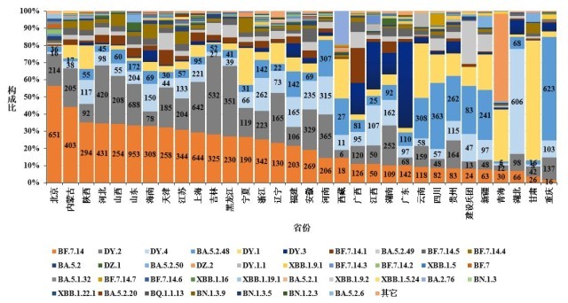 ?。ㄒ唬┛傮w情況。2022年9月26日至2023年4月20日,全國共報送41681例本土病例新冠病毒基因組有效序列,均為奧密克戎變異株,涵蓋158個進化分支,主要流行株為BA.5.2及其亞分支(構(gòu)成比66.2%)和BF.7及其亞分支(構(gòu)成比29.8%)。其中,BA.5.2及其亞分支包括DY.2(16.7%)、DY.4(11.6%)、BA.5.2.48(11.2%)、BA.5.2.49(8.5%)、DY.1(8.3%)和DY.3(5.1%)等;BF.7及其亞分支包括BF.7.14(21.0%)、BF.7.14.1(3.1%)、BF.7.14.5(2.4%)、BF.7.14.4(2.0%)、BF.7.14.3(0.3%)和BF.7(0.3%)等。114個進化分支的構(gòu)成比小于0.1%(共占1.1%)(圖4-1)。