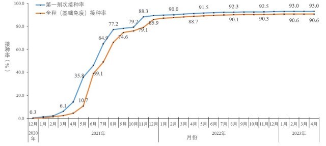 以2022年底全國老年人專項摸底調(diào)查人口數(shù)為基數(shù)統(tǒng)計,截至2023年4月20日,60歲以上老年人第一劑次接種覆蓋人數(shù)占老年人群的96.1%,全程接種、第一劑次加強免疫接種人數(shù)分別占符合接種時間間隔老年人群的96.7%、92.6%(圖5-3)。