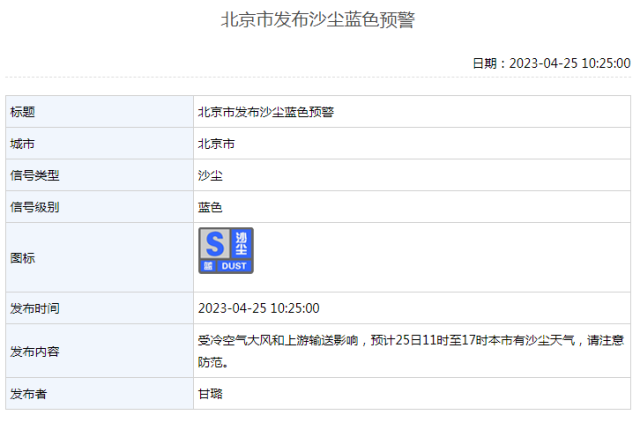 2023年04月25日10時(shí)25分,北京市氣象臺發(fā)布沙塵藍(lán)色預(yù)警。