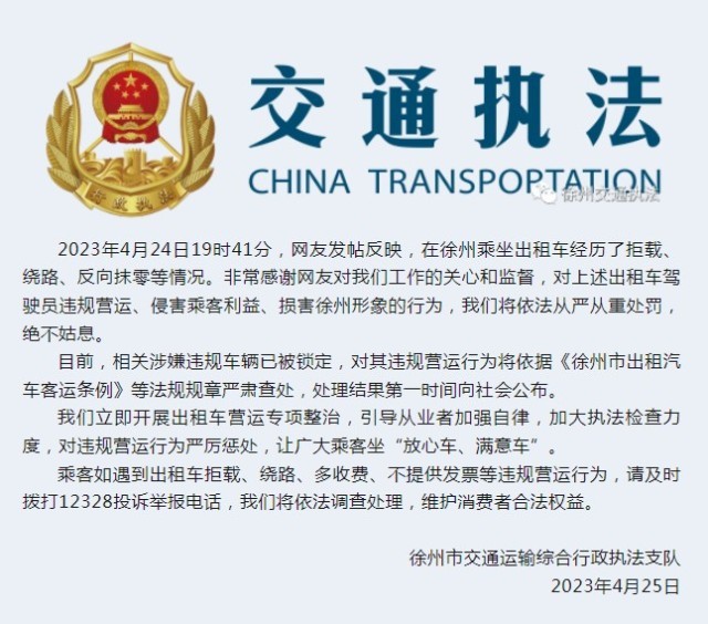 中新網(wǎng)4月25日電 據(jù)徐州市交通運(yùn)輸綜合行政執(zhí)法支隊(duì)微信公眾號(hào)消息,2023年4月24日19時(shí)41分,網(wǎng)友發(fā)帖反映,在徐州乘坐出租車(chē)經(jīng)歷了拒載、繞路、反向抹零等情況。