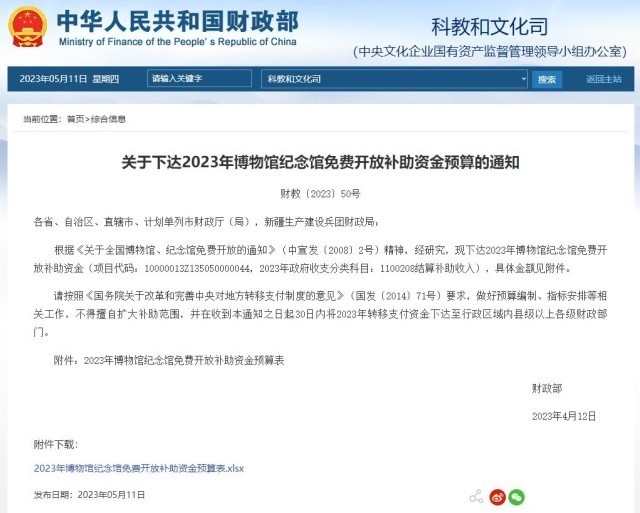 財政部:2023年博物館紀念館免費開放補助資金預算下達