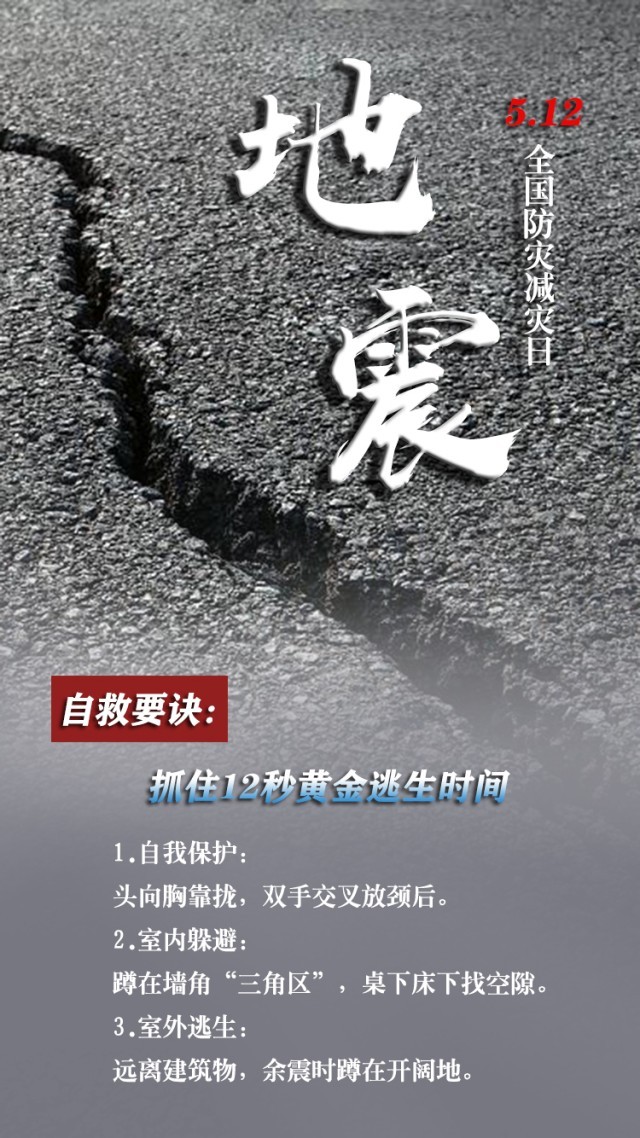 今天是第15個全國防災(zāi)減災(zāi)日。自然災(zāi)害隨時可能發(fā)生,及時自救才更有生存希望。地震來時,如何抓住12秒黃金逃生時間?發(fā)生火災(zāi)時,如何躲避火場濃煙?暴雨天如何安全出行?沙塵天氣如何做好防護(hù)……這份實用避險口訣簡單好記,請速速收藏。