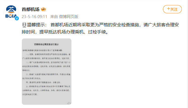 央視網(wǎng)消息:5月16日,@首都機(jī)場(chǎng) 官方微博發(fā)布提示:首都機(jī)場(chǎng)近期將采取更為嚴(yán)格的安全檢查措施,請(qǐng)廣大旅客合理安排時(shí)間,提早抵達(dá)機(jī)場(chǎng)辦理乘機(jī)、過檢手續(xù)。