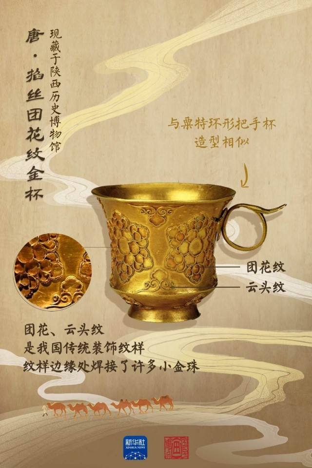 唐代部分帶把杯直接來自中亞粟特,還有部分屬于唐人仿制粟特風(fēng)格的作品。在打磨光滑的杯身上,焊接了四朵黃金質(zhì)地的細絲編成的團花,即團花紋;每朵團花紋的間隙,還用同樣的制作方式焊接了像云朵一樣的紋飾,即云頭紋。團花紋與云頭紋是我國傳統(tǒng)的吉祥圖案,此金杯也是東西方文明通過絲綢之路進行交流互鑒的珍貴物證。