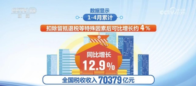 數(shù)據(jù)顯示,1月—4月累計,全國稅收收入70379億元,同比增長12.9%,扣除留抵退稅等特殊因素后可比增長約4%。